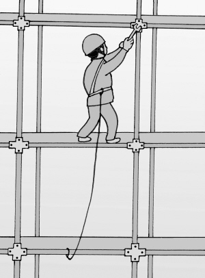 高处作业必须系安全带,安全带的使用有严格的规定,拴带位置应为高挂低用,带绳也不宜过长。而图中正好相反,拴挂靠下,绳又过长,万一发生坠落,下落至挂绳起保护的作用距离过长,容易造成碰撞的伤害。(田 草编绘)