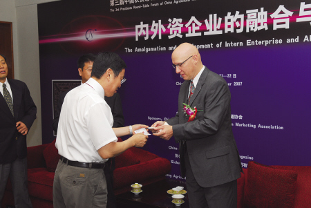 国际肥料工业协会生产与国际贸易委员会执行秘书米歇尔与代表交换联系方式。IFA最近几年正在努力发展中国会员企业。通过米歇尔的引荐,成为IFA会员企业,扩大国际视野,参会的总裁代表们对属于自己的国际俱乐部钟情有加。