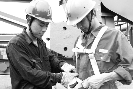 河南油田采油二厂在搞好生产的同时,时刻绷紧安全弦,把安全生产与“生命工程、达标工程”有机结合,有效提高了职工先安全后生产,先生命后效益的安全意识。图为该厂职工在高空作业前系好安全带。 (谢玉文 摄)