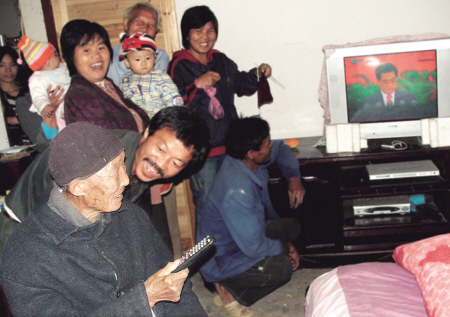 图为10月15日,下花桥镇花桥村100岁老人李维桂观看党的十七大开幕式电视直播。李爱民 摄