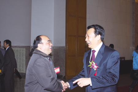 总社党组书记、理事会副主任王君(右)与参会代表握手。