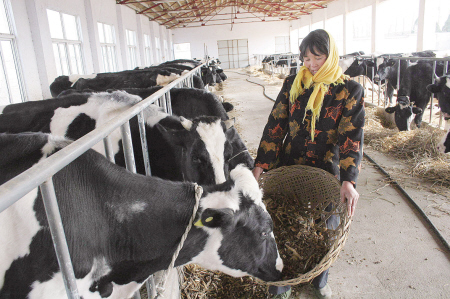 江苏连云港市东海县石湖乡是江苏省最早的牛改示范乡之一。乡政府积极引导农户发展奶牛养殖,2006年以来先后投资200多万元,建起3200平方米奶牛小区,奶牛大户进区养殖。图为该乡养殖户李二深妻子在养殖小区内喂养自家奶牛。 穆道勇 李 辉 摄