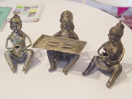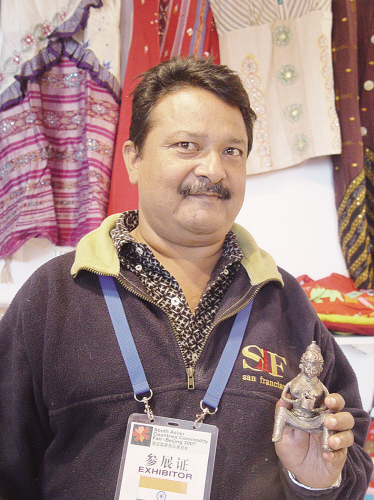 喝好茶要有好茶具来相伴。2007年12月28日-30日,在北京中国国际展览中心举办的南亚国家商品展览会中,印度、斯里兰卡、巴基斯坦等7国的企业展出的涉茶产品,除茶、茶保健品外,还有与茶配套的茶具和工艺品。图为一个印度商人正在展示一件小巧的锡制仿旧工艺品,这件工艺品表现的是一个妇女在喝茶。据分析,从她的装束来看,这是一位1000年前阿萨姆地区的印度妇女,与其配套的还有另一件锡制工艺品,那是一个男人正端着一个茶托盘席地而坐。 章文