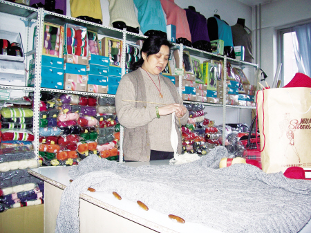 如今机织羊毛衫以花色多、样式繁多被消费者所接受,但是也有不少的人却独爱手工编织的毛衣。图为北京清河毛纺城独一家手工编织毛衣店一角。 钟 宝 摄