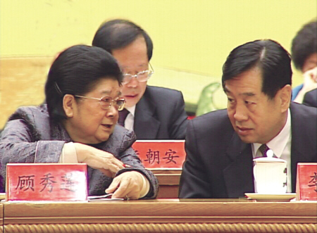 全国人大常委会副委员长顾秀莲(左)与全国政协副主席李蒙(右)出席会议。