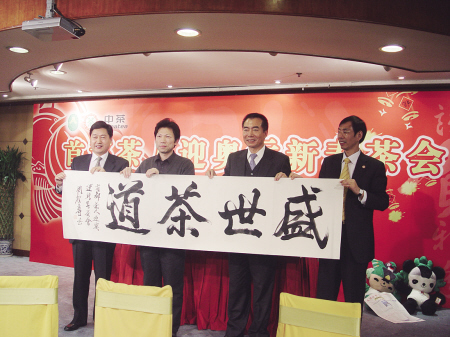 1月28日,在喜气洋洋的节日气氛和浓浓的奥运氛围中,“首都茶人迎奥运新春茶话会”在台湾饭店隆重举行。全国侨联原副主席林丽韫、原国家体委主任伍绍祖、北京市原副市长郭献瑞、中国土畜产进出口总公司总经理刘永福等领导,奥运跳水冠军高敏、奥运射击冠军杨凌,以及在京的茶界专家、学者、企业领导、消费者代表,文化界名人和新闻媒体记者200余人出席了茶话会。