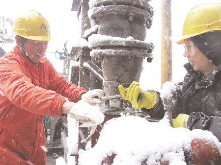 2008年2月2日,江西东北地区普降大雪,给化肥企业的生产带来严重影响,江西贵溪化肥有限责任公司积极开展生产自救,制定了应急预防案,千方百计保生产,多产化肥备春耕。图为贵化职工冒雪抢修磷酸装置1P720输渣泵。黄耀振 摄