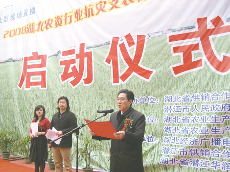 湖北省供销社副主任明平安在仪式上通过电波向全省农民承诺:湖北供销社系统按照省委省政府的要求,全力支持农村抗灾救灾,服务当前的春耕工作。一是抓好资源调配,全省农资系统已组织各类化肥资源近200万吨,加上社会资源,可以满足当前春耕的需要,并郑重承诺:全省无论什么地方出现化肥断档脱销现象,我们保证在3天内全部调运到位;二是抓好及时供应,发挥全省供销社系统10000多家配送经营网络的优势,发挥湖北农资有限公司龙头企业的作用,减少中间环节,切实让利于民。三是坚决杜绝假冒伪劣的坑农害农行为。要始终坚持为农服务方向,真正为农民增产增收、为农村经济、乃至全省经济又好又快地发展做出我们应有的贡献。