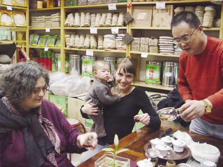 图为在京工作的法国朋友专程来到马连道茶城品普洱,她们对普洱已不是“外行”了。