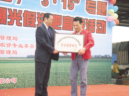 今年3月15日,“红盾护农进村乡3.15专题暨展示优质农资品牌、曝光假洋肥宣传”活动,在广东省惠州市博罗县福田镇荔枝墩蔬菜交易市场正式拉开帷幕。此次活动由广东省工商行政管理局、广东省市场协会农资专业委员会等单位主办,惠州中联农资有限公司及省内外多家农资企业协办。在活动现场,惠州中联农资有限公司总经理黎伟接过了广东省市场协会农资专业委员会常务理事单位的牌子。他说,这是一份荣誉,更是一份责任,这责任要我们秉承“以我实力,服务三农”的核心价值理念,为农民朋友节约每一分钱。