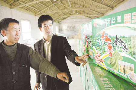 李刚是河南省汤阴县第一个注册成立“农民专业合作社”创业的“大学生村官”。2005年12月,李刚担任麻廷寨村主任助理后,通过市场调研,依托当地盛产优质红薯农产品的优势,投资30万元注册成立了汤阴县顺和薯业合作社。合作社实行统一育苗供种、统一技术指导、统一回收、统一加工销售,以红薯深加工带领群众共同致富。图为李刚正在查看产品包装。 中新社传真 张志勇 摄(CNSPHOTO供图)