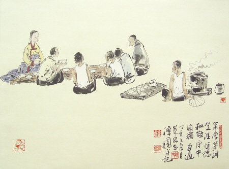 4月23日-27日,韩国画家潭园金昌培北京画院邀请个人展《茶韵》,在京举办。中国是茶的故乡,韩国也一样延续着韩国特有的茶文化。《茶韵》展示了100余件以茶为题材的优秀作品,包括“松下庄子”、“曲江(杜甫)”、“茶圣陆羽先生”等。图为画展中的一幅,笔墨间蕴含了韩国人与茶相共的情愫。章文 摄