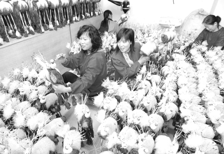 辽宁省义县张家堡乡石佛堡村地处山区,女青年康素敏利用当地盛产的树枝、藤条编织鹿、马、兔等十几种动物条编工艺品,并打入国际市场,远销荷兰、德国等十多个国家,年收入10万元。康素敏致富不忘众乡亲,创办条编合作社,手把手把这绝活无偿传授给40多户农民,现从事条编工艺品生产的妇女达120多人,今年户均收入可达万元,带领贫困山村农民走上富裕路。图为康素敏(中)在向女青年传授技艺。李铁成 摄