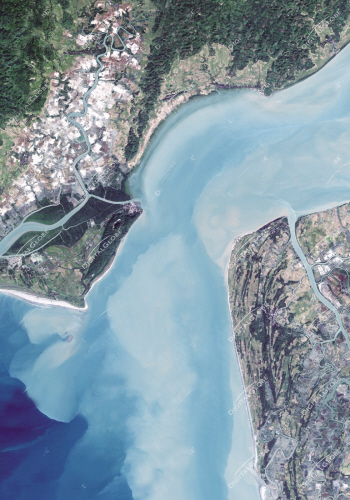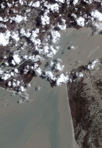缅甸一个名为Hainggyi的地方在遭受热带风暴前后的卫星照片。上图摄于2004年11月11日,下图摄于2008年5月5日。图片来自DIGITALGLOBE