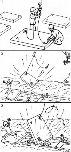 2、一次,吊板行进至沟上部时,被吊盖板的一只吊耳突然拔出,盖板坠下,落入地沟。