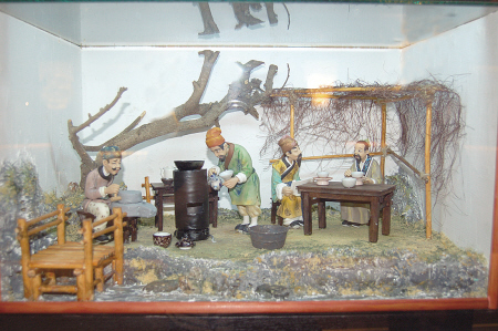 国内著名的茶叶连锁企业天福集团除致力于茶叶销售外,还非常重视茶文化的推广。目前,除在福建漳浦、四川成乐高速公路服务区建立两座大型茶博物院外,还在各地设立了茶文化推广中心。在北京设立的天福茶文化馆位于王府井大街,一楼以销售为主,二楼是一个小型的茶文化博物馆,从茶叶的基础知识、茶叶加工过程实物展示、茶文化的发展史、饮茶习俗等方面全面展示了丰富多彩的中华茶文化。图为茶文化馆中的宋代饮茶模型。大漠 摄