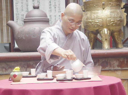 研讨会期间,与会者在天津海雅茶园观看了来自台湾的释圆诚法师亲自演示的“三段十八步茶艺”。当台湾山泉水与海雅山泉水融于一壶时,在场者屏住了呼吸,同根同心血浓于水的手足情,让中华茶艺绽放出更加夺目的光彩。