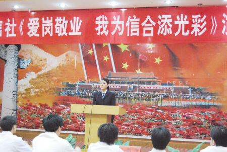 为了丰富信合文化,弘扬无私奉献、爱岗敬业精神,河南省三门峡市湖滨区农信联社五月十九日晚隆重举行“爱岗敬业,我为信合添光彩”演讲比赛。 崔海霞 摄
