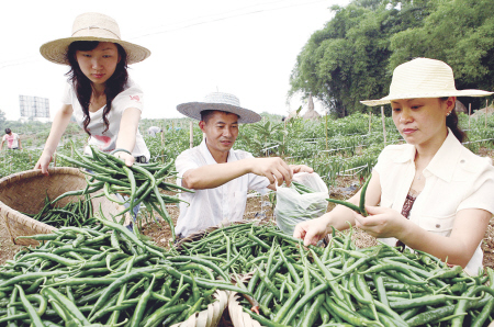 四川省华蓥市永兴镇坚持以“农业增效、农民增收”为重点,根据市场需求带领农民发展特色蔬菜,并实行消费者和商贩自选自购、各取所需的销售方式,把“蔬菜超市”开在了田间,既降低了菜农的生产成本,又方便了消费者。图为四川省华蓥市市民在永兴镇白家龙村村民白瑞元开的“蔬菜超市”选购韩国青椒。