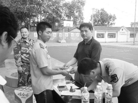 8月1日,湖南道县烟草局有关领导到该县武警中队进行节日慰问,向部队官兵表达了烟草员工对人民子弟兵的真挚谢意和深切祝福。图为该县烟草专卖局有关领导为官兵送上慰问金。 何超录 蒋宇仙 摄影报道