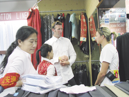 三三两两结伴而来的国际游客,除了再给自己添加一些喜爱的服装外,就是购买一些服装带给家人和朋友。一些人拉着个大旅行箱,他们是利用临走前的时间再次购买一些自己喜欢的服装和家纺用品。一些人胸前挂着奥运会胸卡,这是奥运专员佩戴着自己的明信片。据商铺负责人介绍,本届奥运会上一举拿下8枚金牌的游泳奇才菲尔普斯,25日上午购买了上千元的丝绸服装。