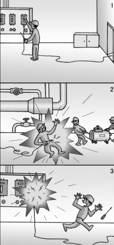 3、另一端在车间内电源箱接完线并顺手合上电源开关的曲某刚往回走两步,身后一声爆响,刚接线的空气开关短路放炮。曲某被吓呆了,脸色发白。