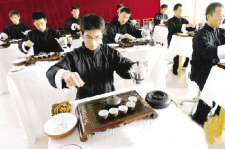 “咚……咚……咚……”,伴随着几声低沉的钟声,9个穿着唐装的大男孩神情专注地端坐在茶桌前,伴随着音乐,未雨绸缪地酝酿着情绪。茶叶、茶壶、茶杯、飘着青烟的香炉在9张古色古香的茶桌上一字排开。