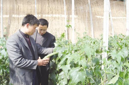宝源公司农化人员在寿光大棚丝瓜试验田查看丝瓜长势情况。