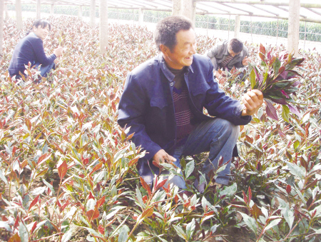 4月26日,山东省梁山县马营乡李庄村65岁农民薛祥申在大棚内收割紫背天葵,喜出望外。据了解,在信用联社的资金扶持下,去年从昆明引进,建起高标准的大棚在梁山县独家试种,通过精心管理,试种成功。紫背天葵是高营养保健菜,集观赏、食用、保健于一体,是绿色无公害稀有蔬菜中的珍品,投放市场后,深受消费者的好评。