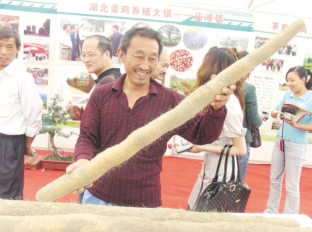 以‘九龙蛟’牌山药闻名的湖北省谷城县,近年来坚持按照绿色无公害标准生产,产品一直呈现供不应求的态势,目前产品已销往全国二十多个大中城市。图为在谷城县举办的农产品博览会上,该县的山药种植大户刘玉国举着他的山药自豪地对记者说:“我这根六公斤重的‘九龙蛟’牌绿色山药,按目前的市场批发价,每斤可以卖到十八元钱呢!” 王轩玲 摄