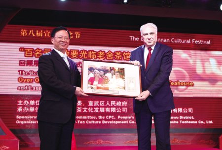 在北京老舍茶馆“老二分”大碗茶的袅袅茶香中,第八届宣南文化节“百名元首政要光临老舍茶馆”回顾展与画册首发式暨中外宾客联谊招待会在老舍茶馆拉开帷幕。11月26日,老舍茶馆内高朋满座,盛友云集。来自阿塞拜疆、立陶宛、毛里求斯、尼泊尔、斯洛文尼亚、乌克兰、摩尔多瓦的驻华大使和俄罗斯、克罗地亚、吉尔吉斯斯坦、保加利亚、塞尔维亚、蒙古、新加坡、柬埔寨、斯里兰卡、捷克、丹麦、墨西哥、古巴、约旦、委内瑞拉、苏丹、津巴布韦、斐济、加纳等国家的驻华使节与社会各界嘉宾160余人相聚一堂,品茗茶、话友谊。北京市政府外事办公室主任赵会民、宣武区区委书记王宁在活动中先后致辞。中国人民对外友好协会副会长冯佐库,国家旅游局国际司司长刘克智,外交部礼宾司副司长谢波华,中联部礼宾局副局长马进,北京市商务委副巡视员刘行苍、市文化局副局长王文光、市旅游局副局长安金明,宣武区委常委、区委办主任赵金花,宣武区人大副主任哈金起、区政协副主席赵印春、区长助理、区外办主任谢全林等领导出席参加活动。