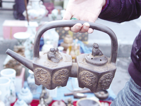 今年春节北京厂甸庙会上,一把“双胞胎”壶吸引了观众的注意力。两个壶身装水,不仅容量大,提着也挺顺手。更重要的是,壶身刻有“元朝”字样。要是真品,那可就太牛了!图2为“双胞胎”壶。 张永立 摄