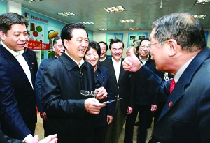 图1:2月12日,农历腊月二十九,胡锦涛总书记下午飞抵漳州,驱车前往漳浦台湾农民创业园。胡锦涛同在场的台商们热烈交谈起来。来自台湾南投的天福集团总裁李瑞河,4年前曾见过总书记,今天再次见到总书记,李瑞河热情邀请总书记到台湾走一走。胡锦涛笑着说:“我一定记住你的邀请。”真诚的交流,真情的互动,展厅里气氛十分热烈。临别时,台商们依依不舍地把胡锦涛送到门口。总书记再次对他们说:“两岸农业合作有很多优势,完全可以发展得更好。我们都应该尽最大努力去做。”李瑞河大声回答:“合作发展,共创双赢!”(文字/孙承斌 谭浩 许雪毅 摄影/鞠鹏)