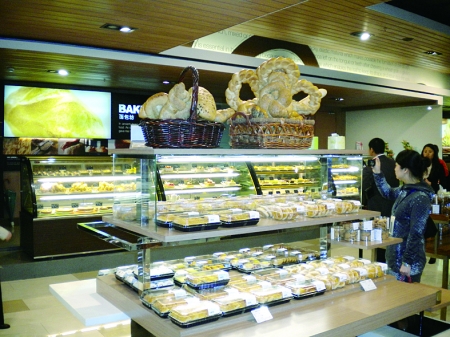 | 货架上整齐陈列的西式面包,都来自其背后的面包房。 |