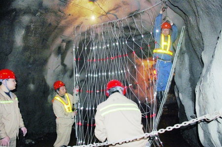 5月4日,在武钢矿业公司程潮铁矿采矿车间井下一375水平7废溜井前,新安装的钢丝“网帘门”让矿工们高兴不已。