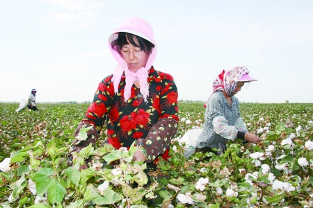 日前,来自甘肃天水的拾花工高得琴、王瑞芳来到了新疆生产建设兵团农五师90团拾花。这是第一次拾花,她们每人每天共拾花80公斤以上,每人每天收入近100元。 刘裕新 摄