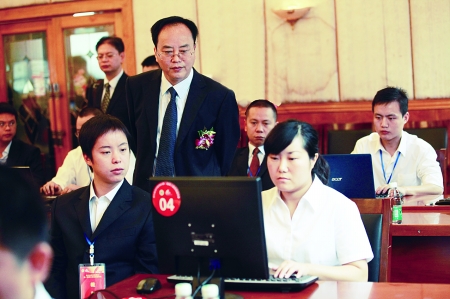 上图为四川省农村信用社联合社理事长王华到竞赛现场视察。