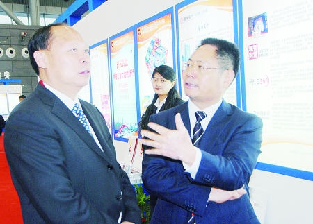 图为11月9日上午,安徽省农村信用社联合社主任陈鹏(图一右)陪同省金融办主任周建春(图一左)在“安徽农金”展台前参观。