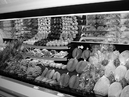 生鲜是有生命的,在卖场里,生鲜商品的不同陈列,体现着该类商品的高低贵贱,卖相较差的商品被堆放在一起打折甩卖,卖相好的商品被放进展示柜里标以高价。蒸腾的水气,精心的装饰,都让无言的生鲜商品散发出生动新鲜的魅力。