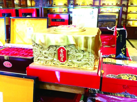 盖香茶叶店内人流拥挤,销售人员告诉记者,店内以散客为主,茶叶礼盒在半个月内平均每天售出300多盒,其中,带有龙年元素的礼盒占整体礼盒销量的85%,主要以红茶和乌龙茶为主。到店顾客同样是购买礼盒,看到有龙年元素的礼盒通常会停住脚步询问价格,因其价格合理的缘故,购买龙年茶叶礼盒顾客的数量远远超过普通茶叶礼盒。在店内购买礼盒的陈女士告诉记者:“我喜欢红色陶瓷质地的茶叶罐装礼盒,因为以红色为底色艳丽又喜庆,黄色的龙盘在罐子上给人的感觉非常的大气,最主要的原因是因为,现在有些礼盒因为包装上带有‘铁观音’、‘金骏眉’的限制,指定只能装这种茶叶,而这种陶瓷罐装的茶叶可以随意搭配,陶瓷罐还能当摆设,一举多得。所以我选择瓷罐的礼盒。”