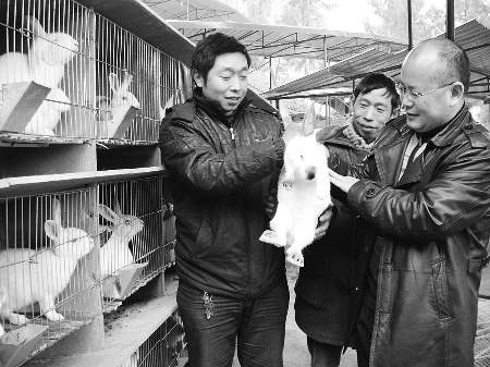 2月7日,重庆市梁平县复平乡安平村的社员在察看肉兔的生长情况。梁平县复平乡出台优惠政策,支持村民成立“美德肉兔养殖专业合作社”,走专业合作社养兔的发展道路,带动了周边的农户把养兔产业做大。为帮助村民解决肉兔的销售问题,合作社与重庆阿兴记集团达成合作协议,对方承诺以每斤7.5元的最低保护价收购村民饲养的肉兔。据了解,肉兔合作社预计今年出栏商品肉兔5万只以上,帮助社员增收200多万元。刘辉 摄