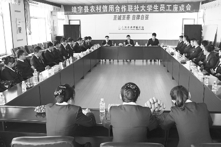 在“五四”青年节到来前,吉林省靖宇县农村信用合作联社召开了大学生员工座谈会。会上,参会大学生员工围绕基层工作进行了座谈,他们畅谈理想,并提出了许多对于农信社的发展的建设性意见。近年来,该联社把大学生员工的培养做为联社的重要工作来抓,对他们的成长倍加关怀,搭建展示才华的平台,组织各种有益于大学生员工成长的活动,发挥他们的聪明才智。