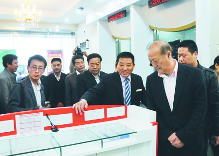 伊川农商行董事长康凤立(右二)陪同全国政协副主席厉无畏(右一)在伊川农商行网点调研。