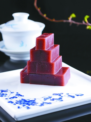 制作:红豆蒸熟过滤;加入木糖醇、琼脂,把红茶水烧开;倒入不绣钢方盘,凉透切成小块即可。