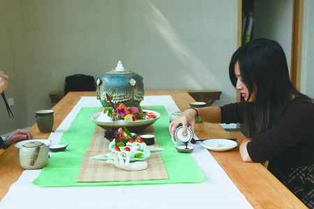平时,我们走进餐厅,桌上最先摆满的是各种盛食器皿,碗、勺、筷子、叉子等等。但是,“食养·U空间”美食会所摆在眼前的却是一些茶具,所享用的美食被盛放在这些茶具里呈现给顾客。总经理续明伟为记者揭示了这其中的缘由,他说,随着生活品质的提高,现代都市人对餐具的使用也更为讲究,做工精巧、高档美观的餐具可以增加用餐的良好氛围。而目前餐具以普通白瓷居多,质量档次还有待提升,艺术欣赏性较低,相比之下,高档次的茶具做工更符合人们所需的高品质生活。记者还了解到,瓷器餐具虽然在过去被公认为是无毒餐具,但近年来也有使用中毒的报告,如果烧瓷器时温度不够或者涂釉配料不符合标准,就可能会使餐具含有较多的铅,当食物与餐具接触时,铅就可能溢出釉的表面混入食物中。相对而言,选用艺术感强、品质高档的茶具较有优势,虽然价格成本高,但兼备美观的同时可以确保品质。