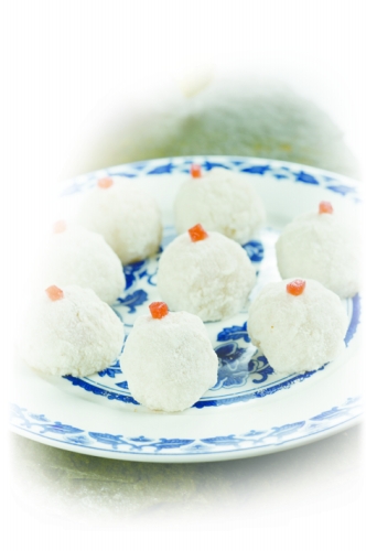 5.取适量糯米饭,包入馅料,捏合到一起。在上面撒上面粉,点缀切好的山楂糕即可。
