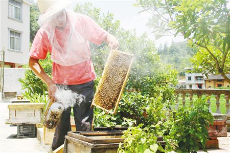 近日,江西省遂川县大坑乡大洲村蜂农在取蜂巢前用点燃的木屑烟雾熏蜂离开巢框准备提取蜂蜜。被外界誉为“野桂花蜂蜜原产地”的遂川县大坑乡大洲村,该村有林地面积11310亩,其中原始次森林中被称为“蜜源之王”的野桂花林地面积8000多亩,村里漫山遍野的野桂花是发展养蜂业的天然资源。目前,全村百分之七十的村民发展这项富民的“甜蜜事业”,现有蜂群5000多箱,全村养蜂户年均收入超过3万元。