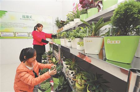 随着互联网普及和信息产业化快速推进,山东省青州市花卉电子商务业发展悄然兴起,初步带动花卉市场由中间批发商模式向企业对消费者的电商模式转变,促使花卉产业结构向买方市场、大众消费主体转型,对打破传统产业格局、促进集群化发展起到积极推动作用。据统计,该市有六百多花农建立了自己的网站,通过电商年销售花卉苗木五亿多元。图为三月十三日,山东省青州市一家花卉电子商务公司员工在管理即将包装发货的微型花卉盆景。