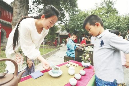 6月1日,位于北京市阳台山麓的大觉寺明慧茶院举办了“儿童古琴及茶文化体验”亲子公益活动,吸引了很多游客带孩子参与。其中茶文化的体验是孩子们争先恐后参与的项目。明慧茶院茶艺师在茶艺展示中,奉上一杯杯淡淡的白茶,让孩子们从茶器摆放与茶叶冲泡间获得的不同于其他饮料的体验。