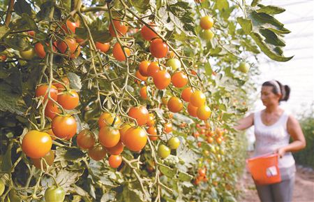近日,河北省邯郸县河沙镇七岔道村轩宇农业科技园“航天蔬菜”喜获丰收,工人正在采收航天番茄。据悉,该科技园种植了230亩“航天蔬菜”,包括航天番茄、航天蛋茄、航天辣椒、航天丝瓜、航天茄子等。以航天番茄为例,每亩产量可达3万斤,维生素C的含量是普通番茄两倍多,每亩纯收入达15万元。郝群英 摄(cnsphoto 供图)